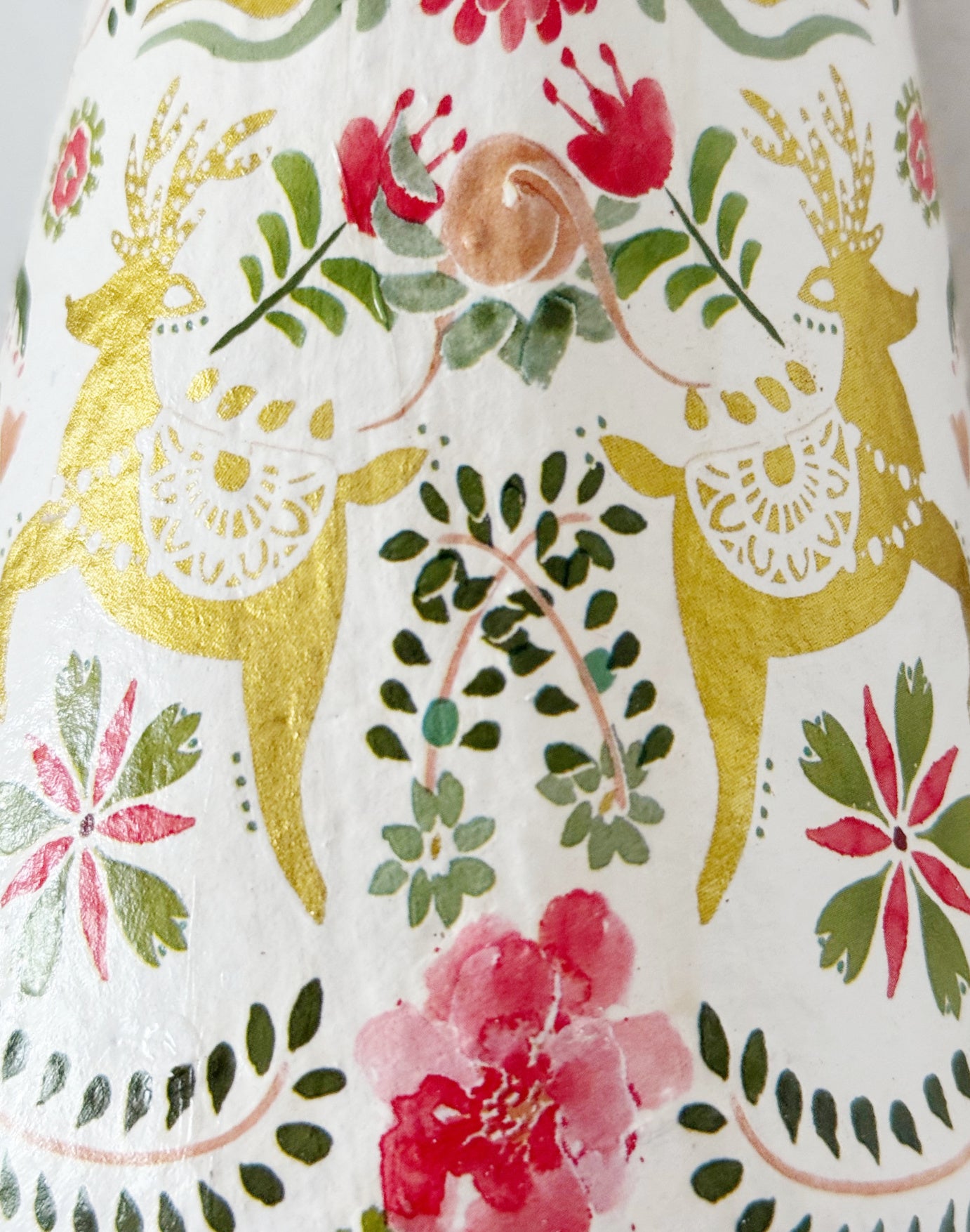 Papier mâché. Folk art design. Approximately oversized (because Christmas should always be a little larger than life).